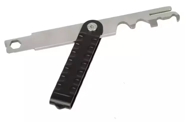 Tällä kätevällä työkalulla on helppo puhdistaa 12 krittistä pintaa AR-15 lukosta ja luistista ja sillä on myös kätevä irroittaa iskupiikin sokka luistista.