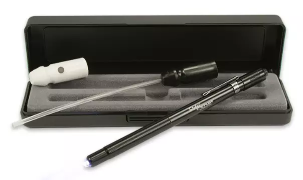Vedenpitävä alumiininen runko, toimii 3x AAAA paristoilla.