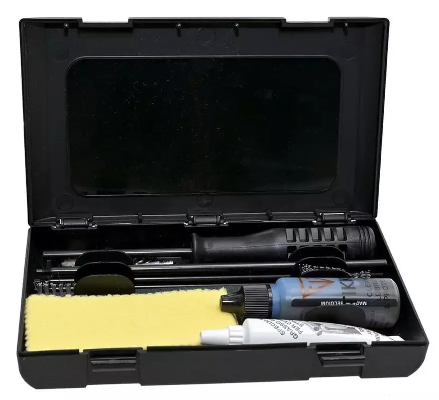 Pakkaus sisältää 76 cm pitkän puhdistuspuikon, kaksipäisen nylonharjan, puhdistuslappuadapterin, 12 puhdistuslappua, kaksi messinkiharjaa, nylonharjan, villaharjan, 25 ml aseöljyä ja 10 ml aserasvaa. Näiden tarvikkeiden avulla voit suorittaa perusteellisen puhdistuksen ja varmistaa, että aseesi pysyy hyvässä kunnossa pitkään.